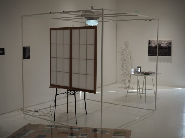 横には田中朝子さんの、今村さんからもらったドローイング(今村さんが障害者施設でのワークショップの時に参加者からもらったドローイング)などを使った不思議な作品群があって、入口側の壁には、今村源さんのワイヤーの立体や稲垣さんの写真を使った半立体作品が展示されている。