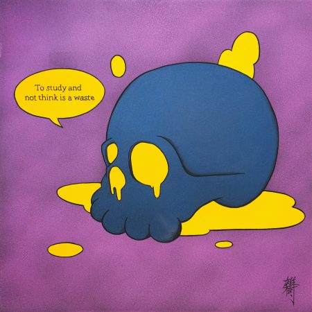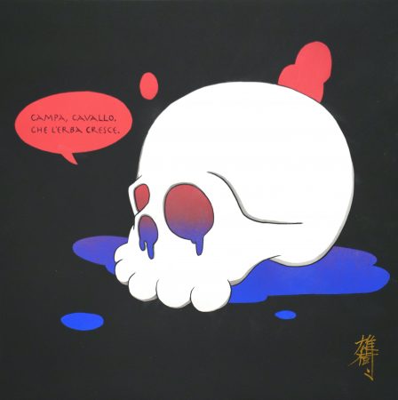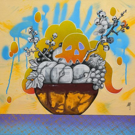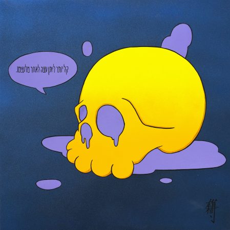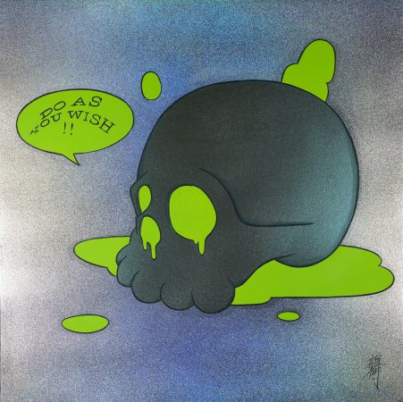 また、「生」は「死」を意識した時により輝きます。作品の中に漫画に使用される吹き出しを入れ込み、死を連想させるドクロをコミカライズすることで、イメージをポップに伝えるようにしています。ワシントンポストのアートレヴューでは「出口は、象徴的なコマーシャルアートから形態を、漫画からは吹き出しを作品に取り入れている。 優雅で伝統的な作品を経て、彼の作品は未来に悠揚たる衝撃を与える。」と評されました。