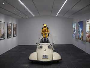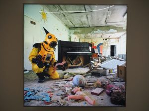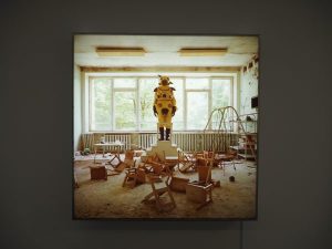 「アトム・カー」「アトム・スーツ」を囲むように、チェルノブイリなどを舞台に撮影された「アトムスーツ・プロジェクト」の大きな写真作品が展示されています。