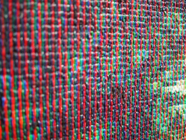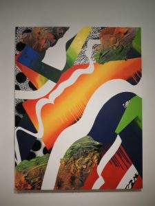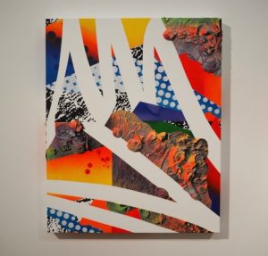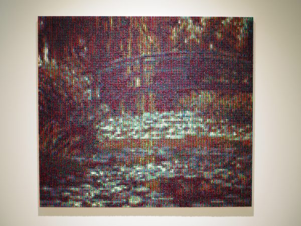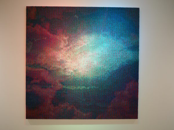 特に「Lux」シリーズは、かなり離れたり写真の画像で見ればはっきりと像が浮かび上がってくるのですが、近寄って観るとCMYの絵具の集積にしか見えません。三色の照明でライトアップされており、ブラウン管テレビの映像を観ているかのような不思議な絵画でした。