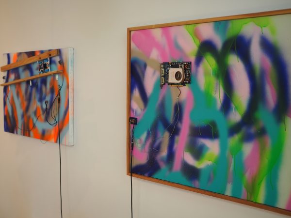 RGB3種の発光するイメージを一つの画面上に描いたタブローに対し、RGB3色のライティングを重ねるインスタレーションを用いた作品「Lux」と、CMY(シアン、マゼンタ、イエロー)の絵具を画面上で混色することによって現れる灰色の絵画面に、ディスプレイ表示においては理論値であり、本来は吸収されているはずのRGB輝度値がランダムに表記された新シリーズ「Noumena」が展示されていました。