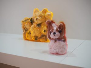 「metaraction」シリーズが本当に面白いですね。やってることは、透明の型にぬいぐるみなどの既製品を封入しただけなんですが、顔を歪めながらも封入されている人形の表情がなんともいえません。既製品を形どった透明の型に既製品をいれることで、それぞれの特徴が歪み、不確かな存在となっています。既製品のあり方や既製品で溢れている私たちの生活について少し考えさせられますね。