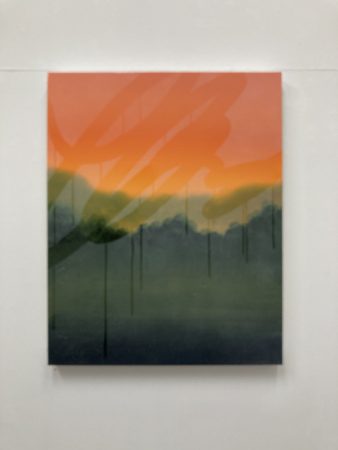 鉄錆で描かれた作品で、染み付いた錆を痕跡の象徴として表現しており、今回は、造花モチーフの作品と破れた金網モチーフの作品が展示されています。