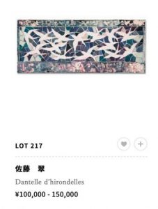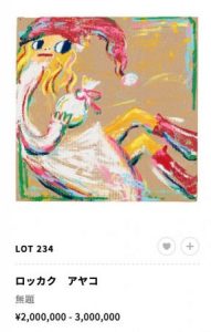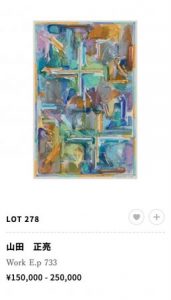 6月のSotheby’sでは大作が623万円で落札されました。本当に良い作家さんですが今回の作品は個人的には少し微妙かなと…やはり前回のSBIの作品のような躍動感のある作品がいいですね。