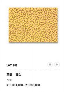小さなサイズの網の作品です。草間さんを象徴する黄色と赤色で構成されており、小作品ながら草間さんの世界観を感じることができる作品ですね。網などの抽象的な要素が強い作品は大きい作品でこそ草間さんのパワーを感じれますが、普通の人には手が出せないレベルまで価格が上がってきていますので、小作品のユニークピースを探されている方は狙いに行ってもいいかもしれません。比較にならないかもしれませんが、6月のSotheby’sでは似たようなサイズの黄色い南瓜の作品が5000万円近くの価格で落札されていました。