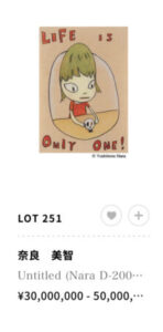 絶好調の奈良さん。この前のSotheby’sでは、出品された二作品が共にEst上限2倍近くで落札されていました。LOT046は、この作品の版画作品ですが、版画作品となっていると言うことは代表的な作品の一つといえるかと思います。国内外で争奪戦になりそうですね。