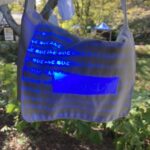 布のバッグや巾着などの無地のシンプルな”通園グッズ”が吊るされているのですが、ブラックライトを当てると文字が浮かんでくる作品です。コンセプトを理解している人は少なかったように感じますが、やはりこういった体験できる作品は人気が高かったですね。老若男女、皆さん楽しんでおられました。