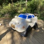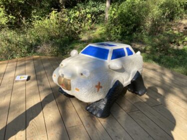父が六甲山のガードレールにぶつかる事故を起こしたエピソードから連想された作品で、人間界と動物界を隔てるガードレールを突き破った車が野生に帰っていったストーリーです。木彫りの動物のような車が点々と転がっています。一緒に写真を撮る人が多く人気でしたが、私は高山植物園の方(裏側のルート)から入ってしまったのでストーリーが少し理解しにくかったです。是非、ROKKO森の音ミュージアムの方順にから見てみてください。