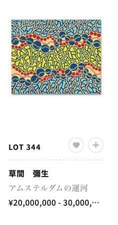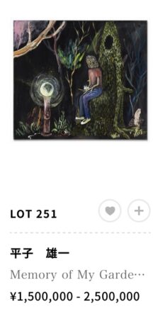 1/21のChristie’sでは、45.7cm×53.5cmのペインティングが、約530万円ほどで落札されていました。Estの中間よりも少し下の金額で落札されていたことを考えると、この作品もそのあたりの価格で落ち着くかなと思います。