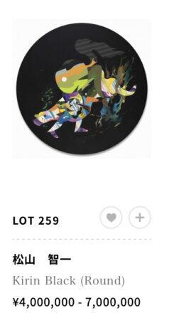 前回のSBIでは、この色違いの作品が954万円で落札されました。ペインティングも85.5×58.5 cmと意外と大きいですし、バッグも作品になっているので、村上隆のユニークピースとしては抑えめな価格の印象でした。今回も似た価格になりそうですね。