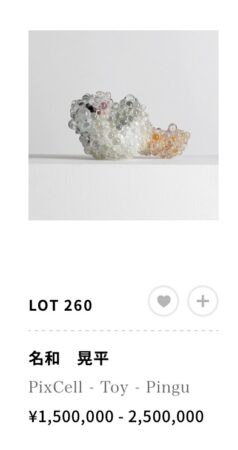 2019年のSBIで、ピングーモチーフのほぼ同じサイズの作品が約240万円で落札されています。今回もこの辺りの価格で落札されれば、プライマリーとそれほど差は無いのかなと思いますが、だんだんとPixCellは手に入れにくくなってきているので狙っている方は多いかと思います。小さいPixCellを探している方はチャンスですね。
