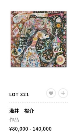 花井さんの作品は60cm台の作品が出品されることが多いですが、今回は91×91cmの作品です。前回のSBIでは65×65cmの作品が、1069万円で落札されました。海外での展示も増え、注目度も以前よりも増している事を考えるとかなり上がるのではないかと予想しています。