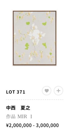 いい作品ですね。中西さんの作品はEst中間から下限の間で落札されることが多い傾向です。小さい作品かすごく大きい作品が出品されることが多いので、今回の作品はサイズ的にいいサイズ感かと思います。