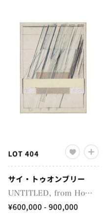 ポスターとかだと割と流通していますが、トゥオンブリーの作品が出てくるのは珍しいですね。昨年のArtcurialでは、この作品が約55万円で落札されていました。国内の流通量を考えるとそれよりは上がるのではないかと予想します。