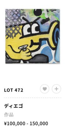 単調になりがちなジャンルですが、DIEGOさんは表現方法が多彩で、非常に楽しみな作家さんですね。サイズは36.5×36.5cmと小型サイズですが、DIEGOさんらしい可愛いキャラクターが描かれています。個展も非常に話題になっていたことから、Estの価格は超えてくると思います。