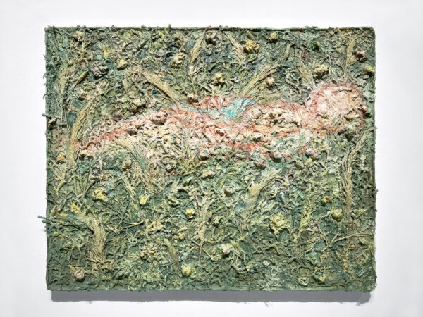 - 黒宮菜菜《鳥を抱く#6》木製パネル、綿布、ジェッソ、油絵具、蜜蝋、葦(アシ)、ヒカゲノカズラ、ケイトウ 2023 Courtesy of Gallery Nomart